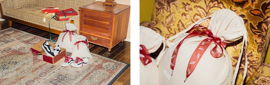 Vansロゴが総柄プリントされたリボン付きで、